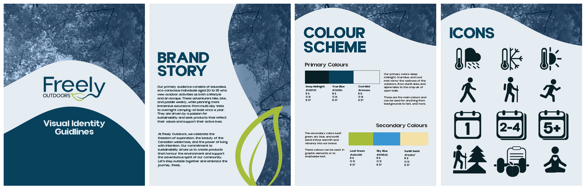 Freely Outdoors is a reimagined identity for a modern outdoor gear and apparel retailer. The project focused on developing a complete visual guide including logo, typography, colour palette, iconography, and social media marketing.