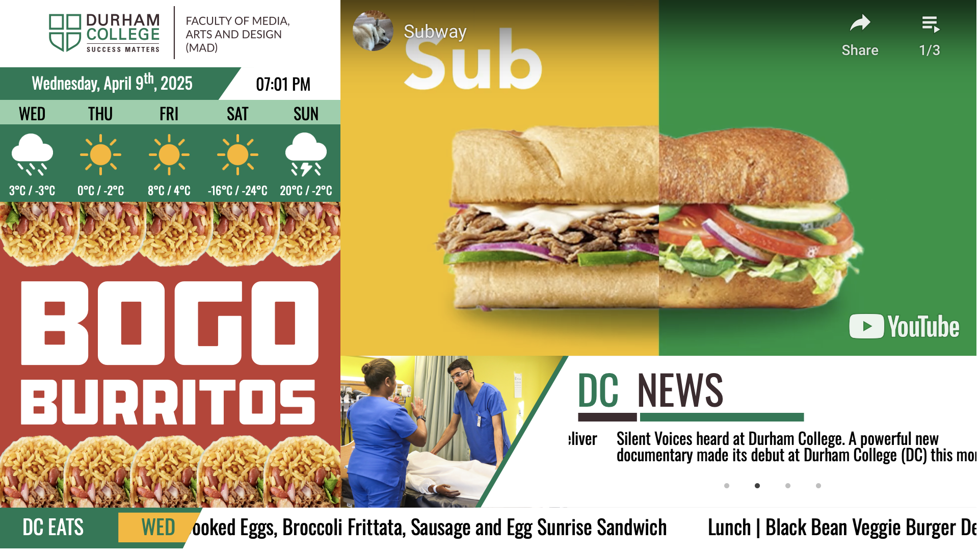 This project focused on designing and creating an infographic to be displayed on tv screens in a public area and to be updated by using php. For the design we had to use the Durham college branding and display the time/ date, weather, motion graphic ads, youtube video ads, news and the breakfast, lunch and dinner menus.